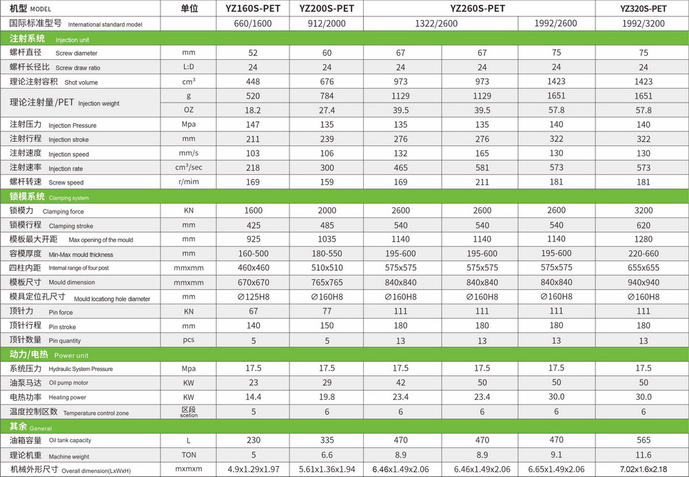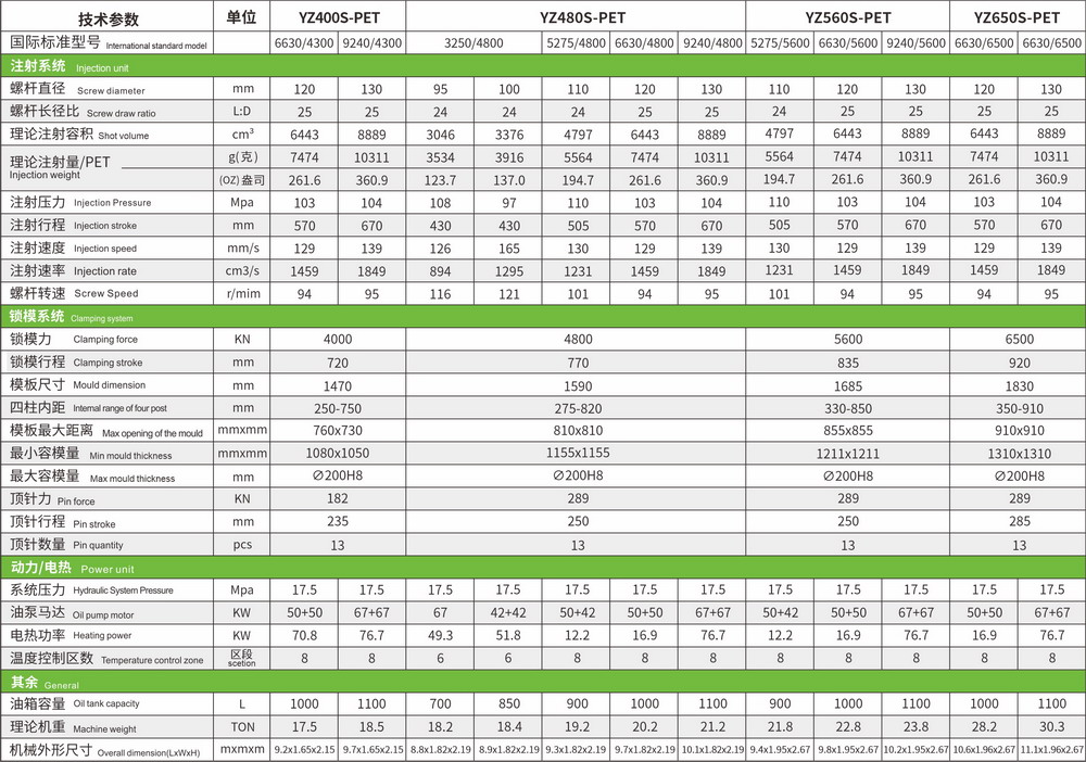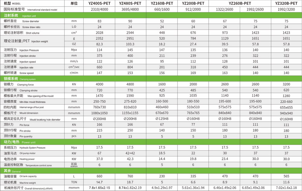 PET機型參數(shù)表(適用于飲料瓶、油瓶)