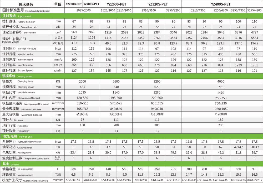 PET機型參數(shù)表(適用于飲料瓶、油瓶)